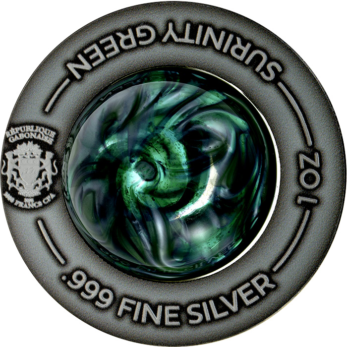 Lícna strana prstencovej mince nesie emblém Gabonskej republiky a nominálnu hodnotu údaje o rýdzosti, rok emisie a názov série „SURITY GREEN“.