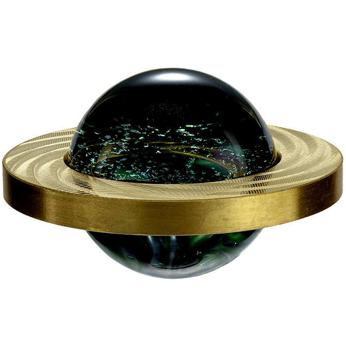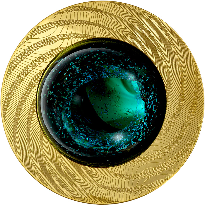 Motív rubovej strany prstencovej mince nesie gilošovaný vzor, ktorého jemné linky pod rôznymi uhlami vytvárajú optické efekty, odlesky, hĺbku as povrchovou úpravou antique štandard dotvára krasu mince. Do stredu mince je vložená zelená sklenená guľa od slávneho amerického umelca Kevina O'Gradyho. Každá guľa je individuálne vyrobená a úplne jedinečná. Stred gule je naplnený časticami zlata, striebra a platiny, rovnako ako lesklými kovovými oxidmi titánu, chrómu, zirkónia a horčíka. Vďaka čomu vyzerá guľa ako nekonečný pohľad do samotného stredu vesmíru.