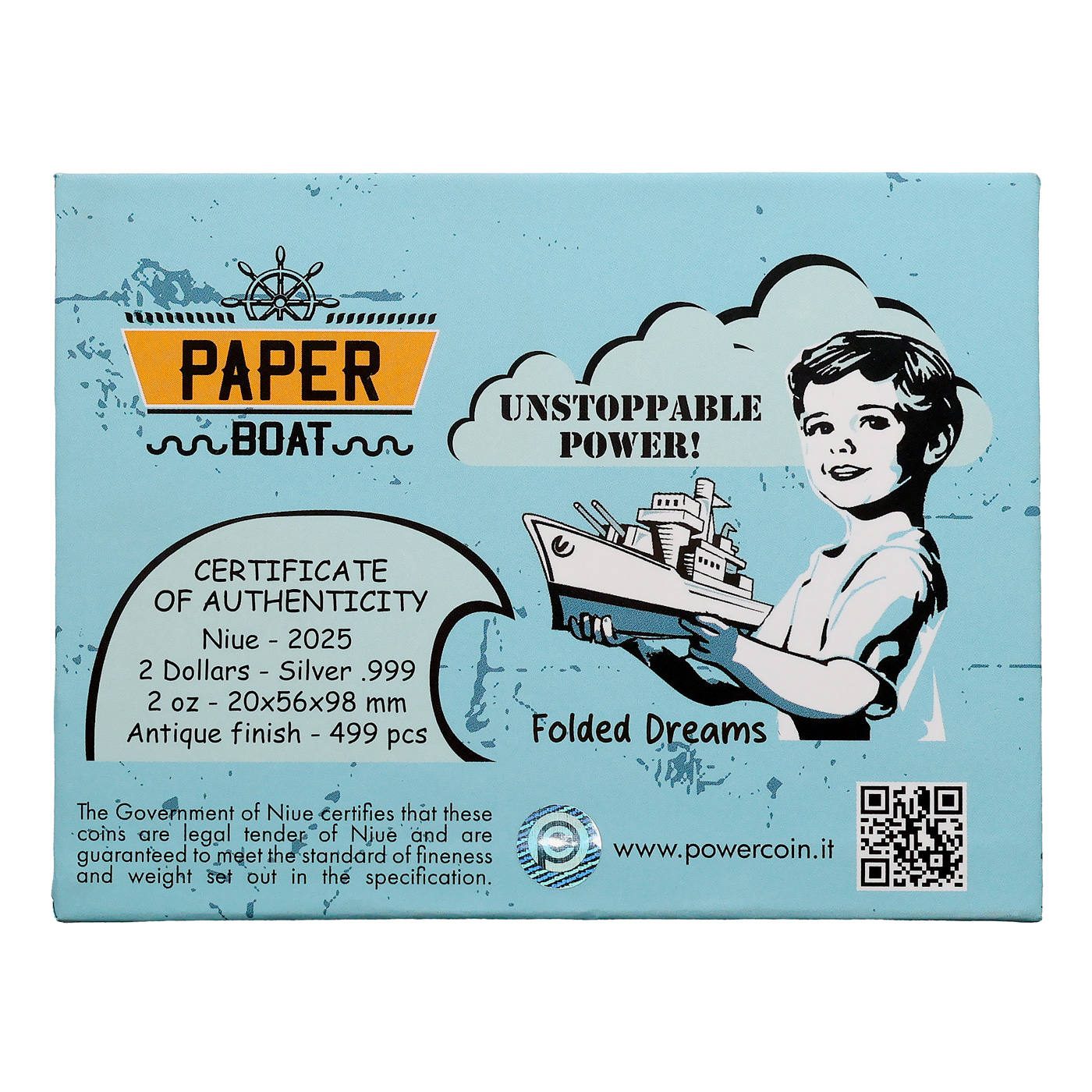 Unikátna strieborná 3D minca, vydaná štátom Niue pre rok 2025 o váhe 2 Oz (62,2 g) v rýdzosti najčistejšieho 99,9% striebra v prevedení Antique Standard, predstavuje druhú mincu série Zložené sny, Papierovú lodičku.